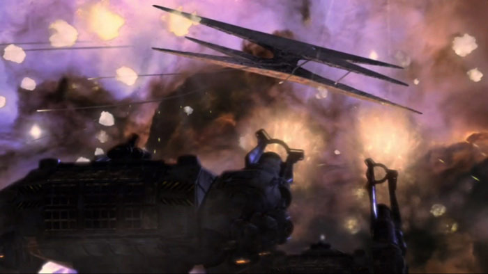 Galactica takes on a baseship at the Ionian Nebula (TRS: "He That Believeth in Me").