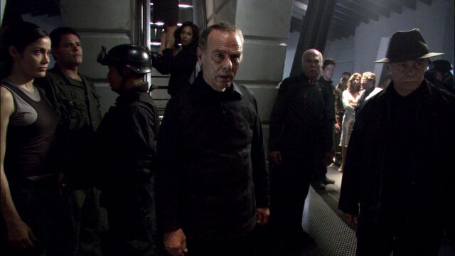 Two John Cavils, "Fleet Cavil" and "Caprica Cavil," en route to their execution as the Final Five watch their procession (TRS: "The Plan").